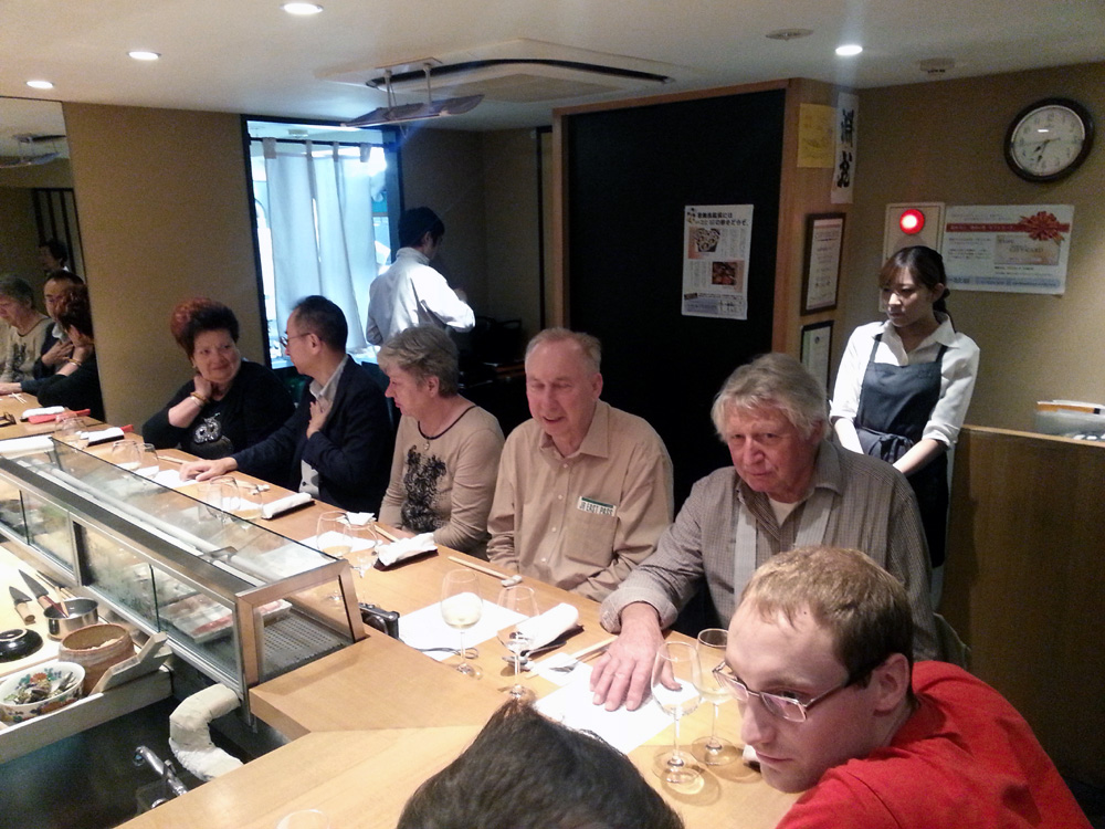 Am Abend lud uns Yoshi-san in ein Sushi-Restaurant. Der Besitzer bezieht Wein aus Yoshi's-Kellerei. Das Lokal heißt Sushi und Wein. Es gibt hier auch österreichischen Wein! Wir konnten bei der Herstellung der Sushi zusehen. Der Reis wird mit den Händen geformt und dann, je nach Art, belegt. Traditionell wird Sushi in Japan aus der Hand gegessen. Eingelegter Ingwer, der sogenannte Gari, wird zwischen den einzelnen Sushi gegessen, um den Geschmack der unterschiedlichen Fische zu neutralisieren. |