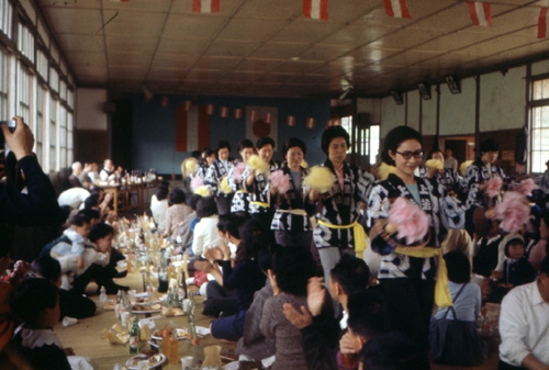 | Am nächsten Morgen ging es bei strömendem Regen zurück nach Ohasama, wo um 10 Uhr vormittags des 13. Mai in einer Turnhalle 300 Mann der Feuerwehr zum Empfang angetreten waren. Ansprachen und Auszeichnungen zeigten auch hier von der Verbundenheit der beiden Städte Ohasama und Berndorf. Am Nachmittag war großer Empfang im Saal eines neu erbauten Lagerhauses in Ohasama, wo die Bürger von Ohasama anwesend waren und wo anlässlich meines Besuches eigenartige Tänze in einmaliger Form durch Mädchen jeden Alters vorgeführt wurden. Die Begleitmusik hiezu wurde auf typisch japanischen Saiteninstrumenten vorgetragen. Die Musikkapelle der Highschool intonierte mehrere flotte Märsche, sowie die österreichische und die japanische Nationalhymne. Abends war wieder ein gemütliches Beisammensein im Kreise der sehr musikalischen Familie Murata. |